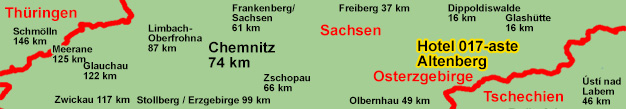 zwischen Glashütte (15 km), Frauenstein (18 km), Dippoldiswalde, Freiberg, Aussig, Chemnitz (73 km) und Prag.