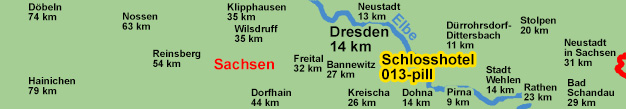 zwischen Heidenau (5 km), Pirna (9 km), Radeberg (17 km), Radebeul (22 km), Kurort Rathen (23 km), Moritzburg (25 km), Coswig (28 km) und Meißen (38 km).