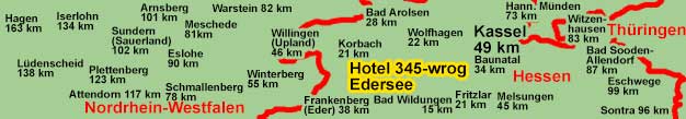 zwischen Edertal (9 km), Naumburg (12 km), Bad Wildungen (15 km), Korbach (21 km), Fritzlar (21 km), Wolfhagen (22 km), Twistetal (24 km), Bad Arolsen (28 km), Baunatal (34 km), Frankenberg (38 km), Marsberg (45 km) und Kassel (49 km).