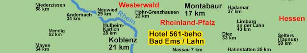 zwischen Nassau an der Lahn (7 km), Braubach (12 km), Lahnstein (15 km), Loreley bei St. Goarshausen am Rhein (17 km), Montabaur (17 km), Miehlen 19 km, Koblenz (21 km), Nastätten 24 km, Katzenelnbogen (26 km), Altendiez (28 km), Neuwied am Rhein (30 km), Diez an der Lahn (31 km), Hahnstätten (35 km), Limburg an der Lahn (43 km), Wiesbaden (64 km).