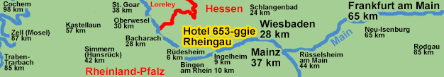 , zwischen Schloss Johannisberg (3 km), Geisenheim (4 km), Schloss Vollrads (5 km), Niederwalddenkmal (5 km), Oestrich-Winkel (6 km), Rüdesheim (6 km), Assmannshausen (11 km), Kloster Eberbach (14 km), Eltville, Lorch, Wiesbaden, Mainz und Loreley.