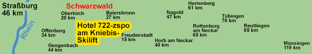 , zwischen Kniebis-Alexanderschanze (5 km), Freudenstadt (15 km), Baiersbronn (21 km), Oberharmersbach (24 km), Appenweier (31 km), Alpirsbach (34 km), Offenburg (35 km), Bühl (37 km), Schiltach (40 km), Baden-Baden (47 km), Karlsruhe (84 km) und Stuttgart (100 km).