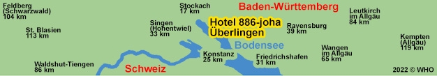 zwischen Meersburg (15 km), Blumeninsel Mainau (19 km), Konstanz (25 km mit der Autofähre), Radolfzell (28 km), Gemüseinsel Reichenau (28 km), Friedrichshafen (31 km), Singen (33 km), Ravensburg (39 km), Stein am Rhein (51 km), Rheinfall bei Schaffhausen (56 km), Lindau (57 km) und Bregenz (64 km).