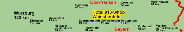 zwischen Gößweinstein (ca. 11 km), Pottenstein (ca. 12 km), Ebermannstadt (ca. 19 km), Bayreuth (ca. 24 km), Kulmbach (ca. 40 km), Bamberg (ca. 42 km), Nürnberg (ca. 66 km), Coburg (ca. 68 km) und Würzburg (ca. 120 km) in Oberfranken.